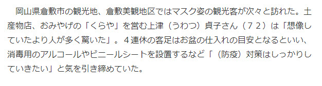 この4連休入りに際し各マスコミから取材いただきました。何かと問題ありげなGO-Toキャンペーンなども東京を除く地域で取り組まれるようですが新型コロナの問題解決には至らないので県外からの観光客は以外と多いのですが年配の方は少なく若者が多いように感じます。お土産の消費に関しては若い観光客ほど少なく特にアベックは食べ歩きが主体の傾向があります。ましてやコロナ禍で観光となると職場へのお土産も積極的とは行かないようです。倉敷美観地区エリアで営業されている皆さんも相変わらず大きな影響を受けておりマスコミも熱心に取材に取り組まれているようです。お客さんには来て貰いたいけどウイルス拡散というリスクもある中、防護策はお店にとってもお客様にとっても重要な事と思い頑張って取り組んでおります。
